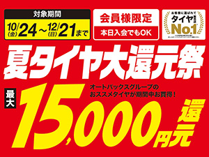 クルマのことならオートバックス岐阜北店へ! ウェブサイト・電話で ピット作業予約ができます! 車検のこと・法定12ヶ月点検のこと、なんでもご相談ください! 多彩なピットメニューで 愛車をケアして快適ドライブ! クルマの買取・販売、 おまかせください! キャンペーン 夏タイヤ大還元祭 – 2025年冬 オートバックスはタイヤが安い!サイズに応じて最大15,000円還元 10月24日(金)から12月21日(日)まで実施 購入サイズに応じて最大15,000円還元!2025年秋冬の カーナビ大還元祭 – 2025年秋 オートバックスなら購入金額に応じて最大7万円還元! 10月24日(金)から11月3日(月・祝)まで実施 購入金額に応じて最大7万円還元!2025年秋冬のドライブ ドライブレコーダー・電子ミラー大還元祭 – 2025年冬 オートバックスなら対象機種購入で最大10,000円還元! 10月17日(金)から1月12日(月・祝)まで実施 対象機種購入で最大1万円還元!2025年冬のドライブがも 2025年-2026年 オートバックスヒートアップキャンペーン – Tune&Dress up スポーツパーツが安い! 2026年3月31日(火)まで実施中 2026年3月31日(火)までメーカー希望小売価格から最大45%OFF 安全点検を無料で実施しています いつでも無料で実施 安心・快適ドライブのためにドライブ前/後にオートバックスで安全点検をしましょう! オート キャンペーン一覧 特集 12ヶ月点検は法律で定められている必須点検です 「CARFUN」クルマに関する知識や話題のトピックスを紹介 商品情報 2025年-2026年スタッドレスタイヤ新製品 – 今シーズンはコレ!おすすめの冬タイヤ情報 凍結路面・雪上路面で安定走行!オートバックスでは、軽自動車・普通車からミニバン・SUVまで様々な種類・サイズ オートバックスはタイヤが安い! – 低価格のプライベートブランドタイヤ 軽自動車からミニバン・商用車向けまで!輸入タイヤから国産タイヤまで!オートバックスはプライベートブランドタイ 2025年 厳選!夏の日差し対策サンシェード – 今年のトレンドは傘型サンシェード!車内の温度上昇を和らげるお手軽アイテム 「暑い」「熱い」「しばらく出発できない」を解消!オートバックスでは車内の温度上昇を和らげるお手軽アイテム・サ 2025年 厳選!クルマの中でも扇風機 – エアコンの直風は苦手!カーファンはやわらかな風で快適に涼しさをアップします 「エアコンの冷気や直風が苦手」な方へ!オートバックスではやわらかな風で快適に涼しさがアップする車内用の扇風機 [車検制度改正] 2025年4月以降 車検満了日の「2ヶ月前」から車検を受けられます 車検の受検可能期間がこれまでの「車検満了日の1ヶ月前」から「車検満了日の2ヶ月前」に!繁忙期を避けて余裕を持 突然やってくるバッテリー上がりを予防 – クルマのトラブル原因NO.1!バッテリーは消耗品です 無料点検をご利用ください!バッテリー上がりを予防して安心ドライブ。バッテリー交換も経験豊富な整備士がいるオー エンジンフラッシング・AQ.オイル添加型メニュー – 走行しながらエンジン内部をゆっくり洗浄 エンジン内部を洗浄することで良好なコンディションを維持!エンジンオイル交換時に専用のフラッシングオイルを注入 ダンロップ SPORT MAXX LUX – 静かな車内空間と優れた操縦安定性能を両立するプレミアムコンフォートタイヤ 静かに走る。なのに走りを楽しめる。操縦安定性能と静粛性能を高次元で両立したプレミアムコンフォートタイヤ・SP ブリヂストン レグノGR-X III TYPE RV – 新たなプレミアムを実現するENLITEN搭載ミニバン/コンパクトSUV専用タイヤ 空間品質と走行性能、サステナビリティ性能を高次元で両立!独自の専用パタン設計でRV車両特有のふらつきと偏摩耗 オートバックスプライベートブランド国産車用バッテリー・エバストロン – 初代PB商品をリニューアルして再発売 高性能で低価格!自動車用バッテリーの初代プライベートブランド商品・エバストロンをリニューアルして再発売。 お 商品情報一覧 新着情報 2025.10.17 夏タイヤ大還元祭 – 2025年冬 オートバックスはタイヤが安い!サイズに応じて最大15,000円還元 2025.10.17 カーナビ大還元祭 – 2025年秋 オートバックスなら購入金額に応じて最大7万円還元! 2025.10.17 ドライブレコーダー・電子ミラー大還元祭 – 2025年冬 オートバックスなら対象機種購入で最大10,000円還元! 2025.10.14 2025年-2026年スタッドレスタイヤ新製品 – 今シーズンはコレ!おすすめの冬タイヤ情報 2025.10.08 オートバックスはタイヤが安い! – 低価格のプライベートブランドタイヤ 新着情報一覧 お得な会員制度 オートバックス公式アプリ いつでもどこでも簡単予約!愛車のメンテナンスを一括管理!お得な情報が届く! オートバックス会員特典 会員ランクに応じて様々な特典が受けられる制度。会員限定のお得情報のお届けも! LINEお友だち募集 お友だち限定、お得な情報いっぱい!LINEお友だち募集中。 トータルカーライフ 心躍るカーライフを車内も出先もかっこ良く。 心踊るガレージライフがテーマ。 自信を持っておすすめするプライベート商品