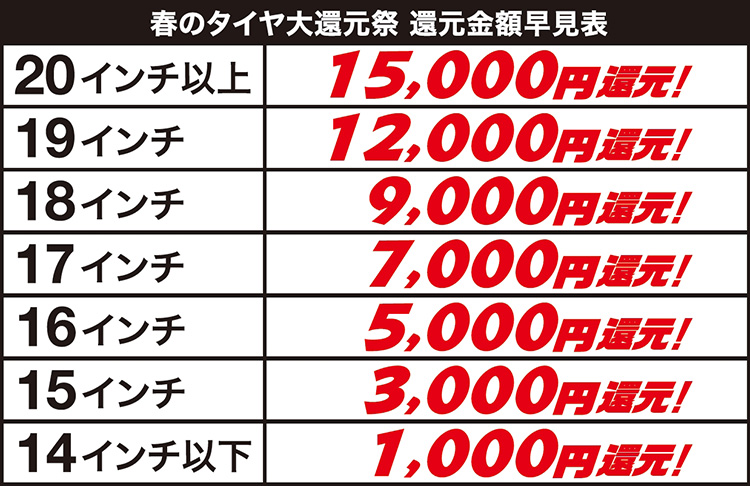 購入するタイヤの税込価格から還元します。20インチ以上/19インチ/18インチ/17インチ/16インチ/15インチ/14インチ以下の4本セット購入で還元額が異なります。