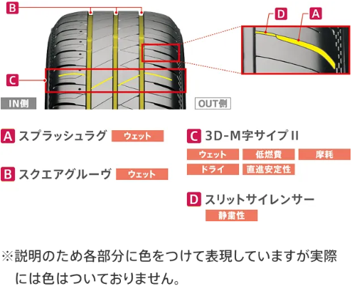 サイプの断面途中を3次元のM字型の切れ込みに加工。接地圧がより均一になることで高いブレーキ性能や耐摩耗性を実現。