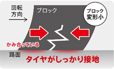 ラグ溝の溝幅を接地端に向けて広くすることで排水性が向上。排水性を上げたことで濡れた路面でのブレーキやコーナリングがより安全に。